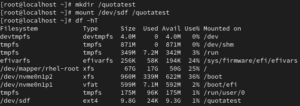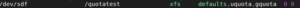 ※마운트할 디렉토리(/quotatest)는 그대로 사용하고 quota를 적용할 사용자(quotauser, quotauser2)는 삭제 후 같은 방법으로 다시 생성해 줍니다. 홈 디렉토리 지정을 위해 /dev/sdf 를 /quotatest 에 마운트한 후 사용자를 생성합니다. 마운트된 상태로 아래를 진행합니다.