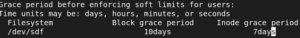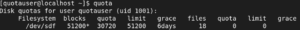 quota 명령어로 현재 사용자의 quota 설정을 확인합니다. 여기서 grace 는 유예 기간을 뜻합니다. 유예 기간 중 soft limit 이상으로 파일을 저장할 수 있지만, 유예 기간이 만료되면 hard limit 처럼 동작합니다.