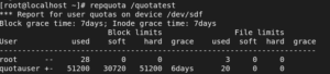 파일 시스템을 언마운트 후 ‘tune2fs -O quota /dev/sdf’ 를 실행하여 이 기능을 활성화합니다.