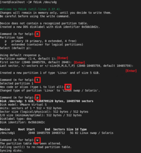 파티션을 설정합니다.(Hex code : 82 Linux swap)