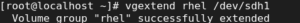 # vgextend rhel /dev/sdh1