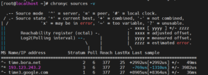 # chronyc sources -v 명령어 사용 시 각 컬럼별 설명을 볼 수 있습니다.